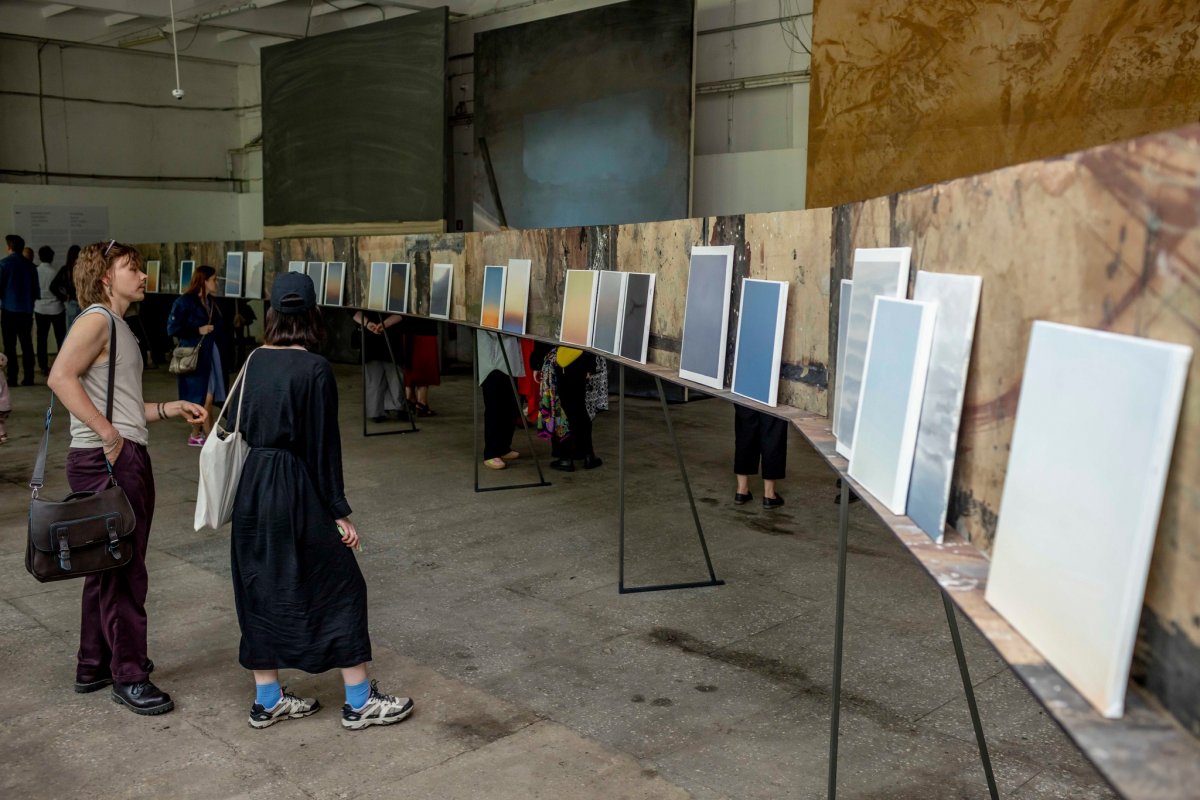 Many of the works shown in the exhibition were created while Eglītis was in a short-term studio this past winter, during which the artist painted the sky every morning from the balcony on the top floor of the Philosophers’ Residence, capturing an unusual view of the city while being closer to the sky.