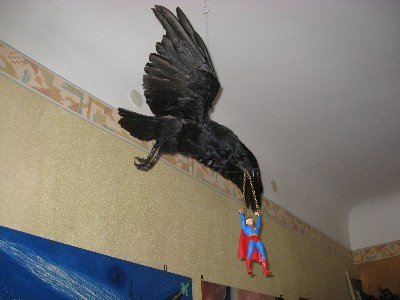 Consequently, Biruta purchased a model of the first Superman from 1938 in Brooklyn. The Raven was caught and stuffed in Latvia, and the Superman flew in from his homeland, the USA (he used a plane, however). I hung him from a gold (not real gold) chain and put him in the beak of the Raven. Both of them experienced the be- ginning of Financial Crisis of 2008. Maybe they can help us survive it.