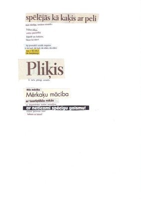 From time to time I read newspapers and cut out words, phrases or sentences that attract my eye; those that I like or find funny or awkward. What you need is a knife for cutting the newspapers and white A4 paper. You can arrange the words any way you like. You only need glue to keep them together. In this way an economically created text is born out of words that have already been used in another context. At the moment I decide to put together a quotation collage I have no idea about the plot and its twists and turns. The story is created by picking and combining items that have been previously intentionally collected. In the process of collecting these words the intention is usually on the level of enthusiastic entertainment. I propose different versions of text to myself and then I choose one, relying on my heart’s feeling. Punctuation marks are not important, only the observation of the ever-volatile relations between delight and suffering. So without any intention I turn to the inhabitants and tools of the garden of life, the world of animals, the weather and natural phenomena, moods through a colour wheel, a huge need to laugh, or the relationships between household items and such – where everything has certain qualities and an inner life. Such conversations with myself happen not only when looking for something but also in the hope of finding something not just useful but also essential.
