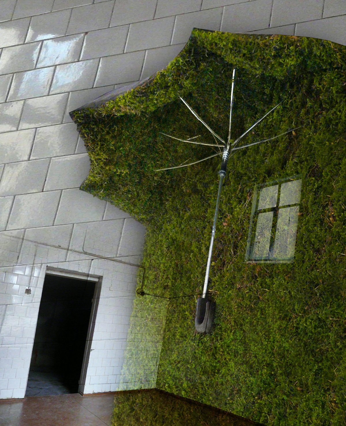 Living in Riga’s urban space, I feel the city has subjected me to its hasty and incessant rhythm. Sometimes it seems that the city’s rhythm materialises and pours down on me like a downpour. It can make me weak and exhausted. In such moments I would like to find a place to hide. I have created my oasis under an umbrella attached to a wall. This place has gathered moss over time, obviously marking its territory. The function and symbols of rain are changed – urban space has replaced raindrops. Each viewer will have a chance to stay in my secret place and feel the magic of the urban oasis. Inspecting the surroundings, it will be possible to notice another object. It looks like a man who had literally become part of urban life. Moss has already covered his legs and is spreading over the walls. Moss is the messenger of forgotten nature. The leg motif is a reference to “Leg”, the work of American artist Robert Gober. With these activities, I invite people to consider how to make their environment more harmonious and balanced.