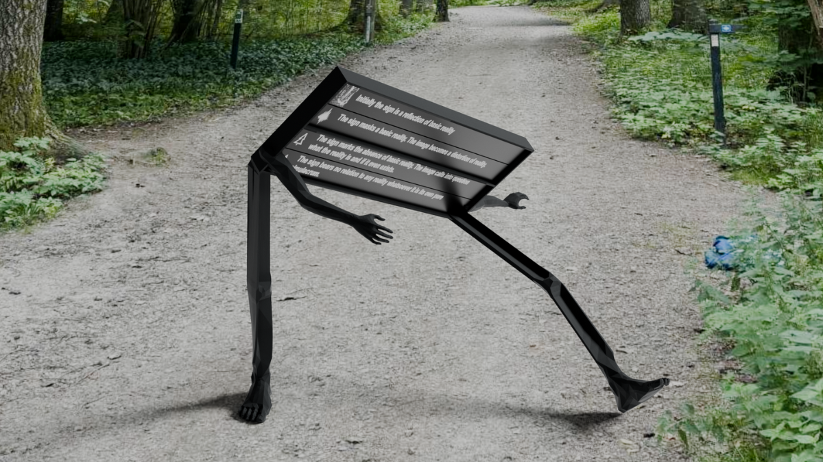 Pastaigas dalībnieki, vadoties pēc īpaši izstrādāta “kompasa” – animēta avatara –, sekos cilpveida maršrutam, kurā digitāli papildinātas norādes kalpo kā performatīvi pieturas punkti, kas atdzīvojas tumši komiskā traģēdijā par orientēšanos vēlā kapitālisma uzmanības ekonomikas apstākļos.